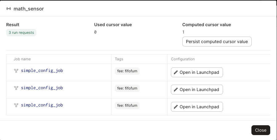Note also that in the example above, both a run_key and cursor are being used. This means that if the cursor is reset but the target files don't change, new runs will not be launched because the run keys have not changed. If you want the ability to fully reset the state of your sensor by resetting the cursor, then you should not set run_key on RunRequest.